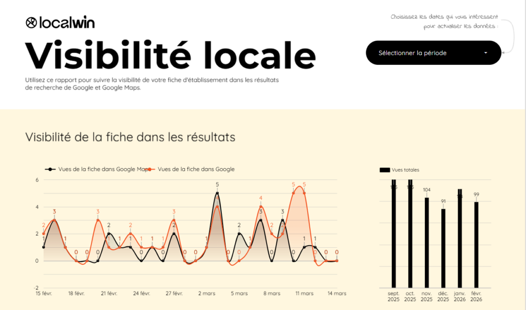 J’ai rencontré beaucoup de prestataires malintentionnés dans ce milieu et je comprends donc la méfiance qu’ont les clients. C’est pourquoi j’ai fait le choix de mettre à disposition (en option) un dashboard connecté à votre fiche d’établissement Google et qui vous donne l’évolution de la visibilité et des leads collectés.